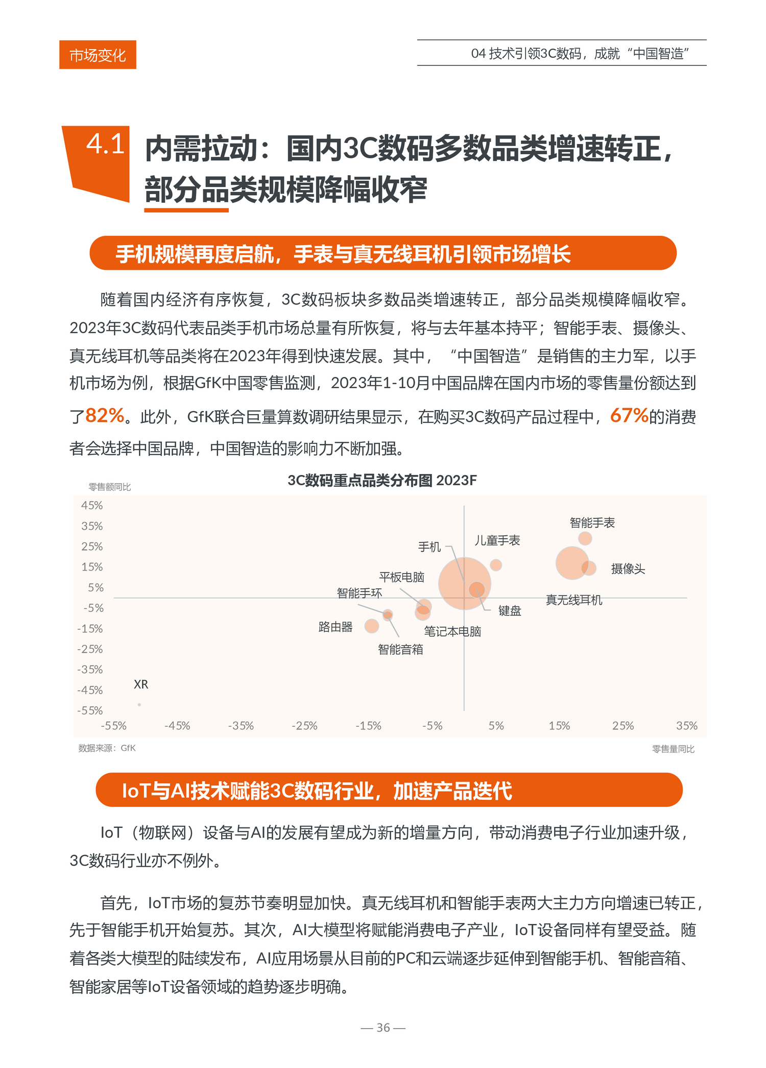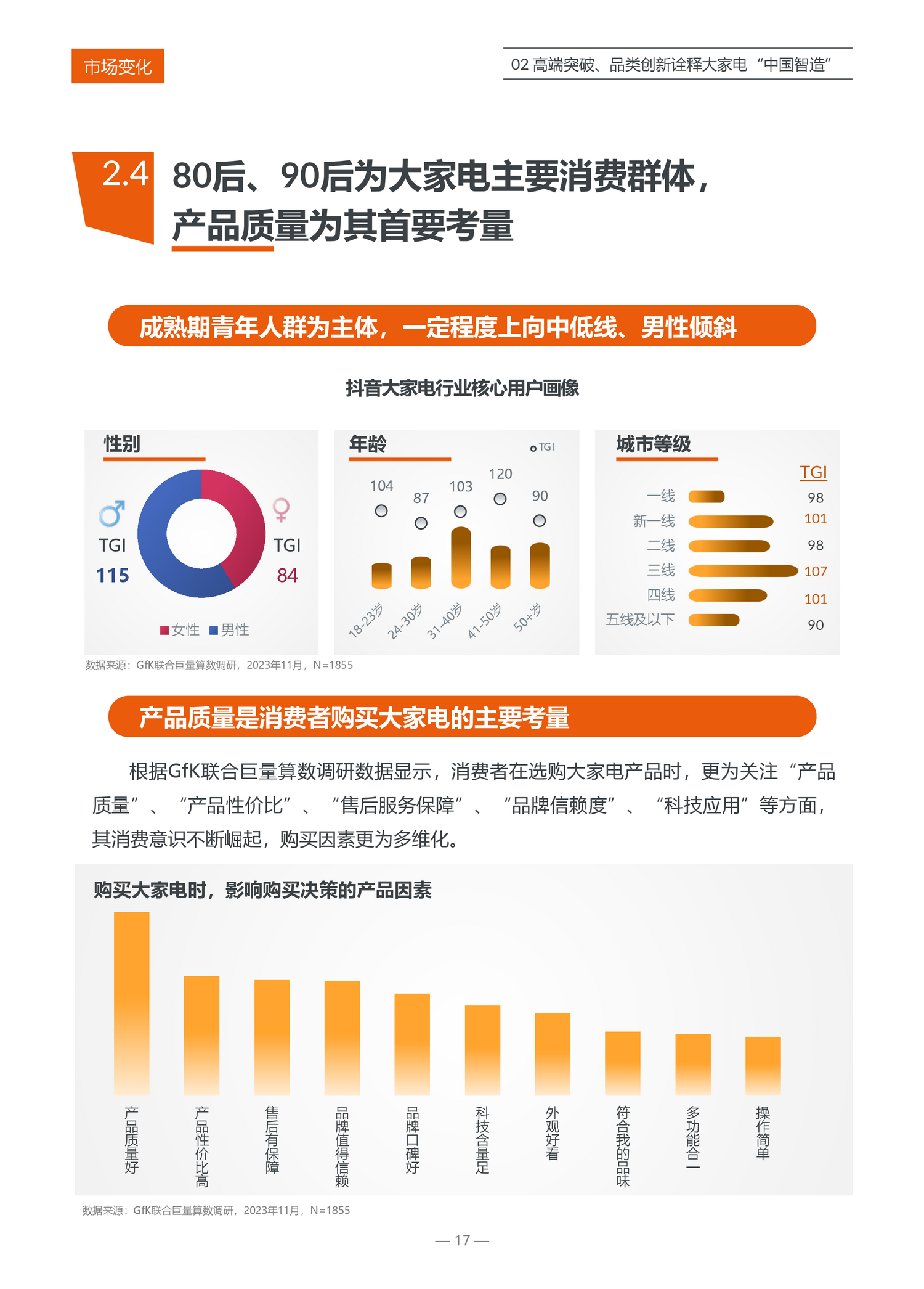 “中国制造2025”于2015年提出,第一阶段已经走过了八年,从中国制造到中国智造,从立足中国到走向全球,从追赶到超越,3C家电行业涌现了一大批优秀的企业和产品。在这一国家高瞻远瞩的重要战略之下,我们看到了行业参与者的孜孜矻矻、厚积薄发,更理解了这背后行业人不断的创新与付出。巨量算数联合GfK共同发布《2023中国智造3C家电行业白皮书》,梳理了行业趋势、发展变化、品类破局点和成功案例,希望对中国智造下一个十年发展有所启迪。